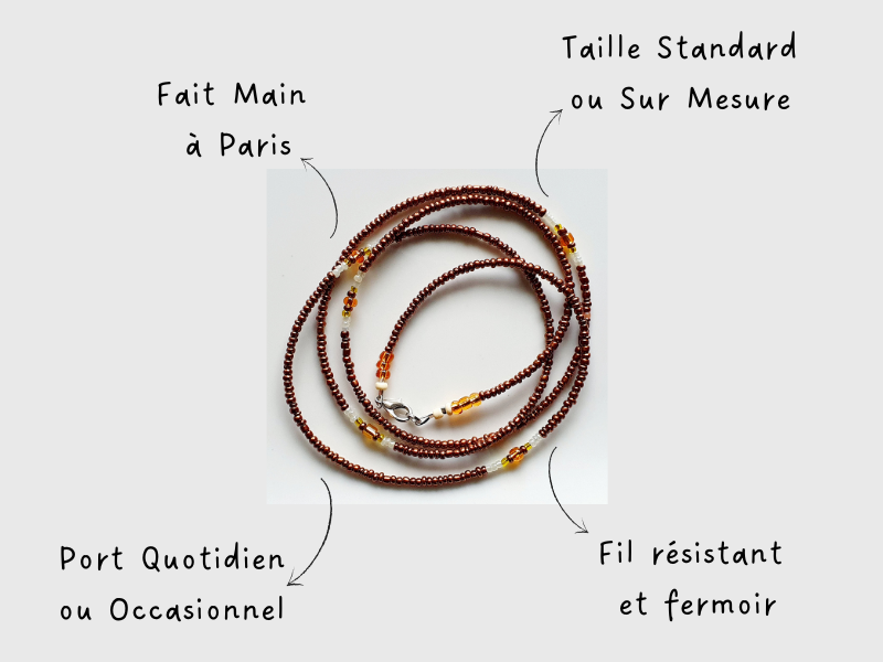 Les tailles de prĂȘt-Ă -porter (pantalon, jupe etc) ne s’appliquent pas Ă nos perles de taille.